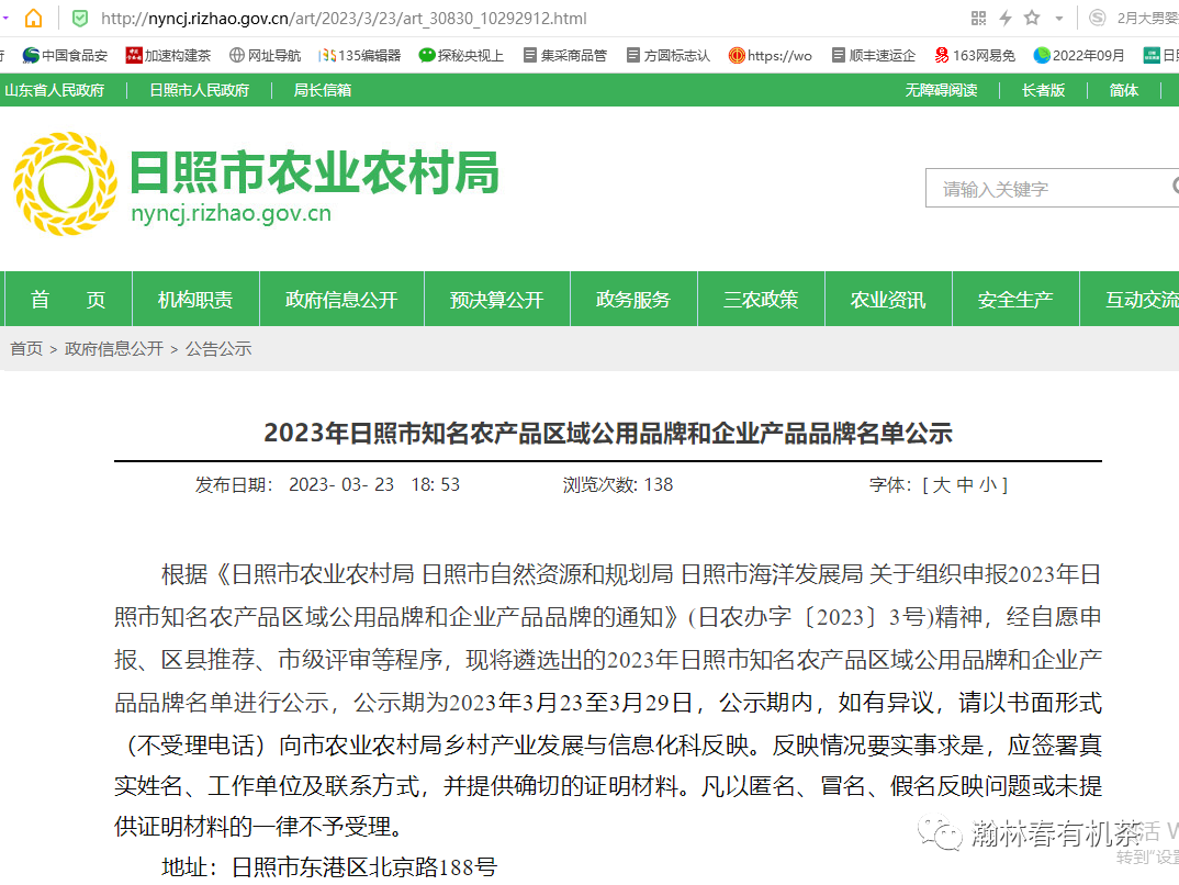 3月,瀚林春“玉芽雪莲“、”瀚林流翠”有机绿茶荣获2023“日照市知名企业产品品牌”